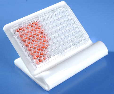A convenient holder for a 96 well Multiwell plate , tilted at a 30 degree angle to view samples without strain. Each stand has a neoprene pad and rubber mounting to prevent slippage of the plate. Ideal to use with Well Orienter.